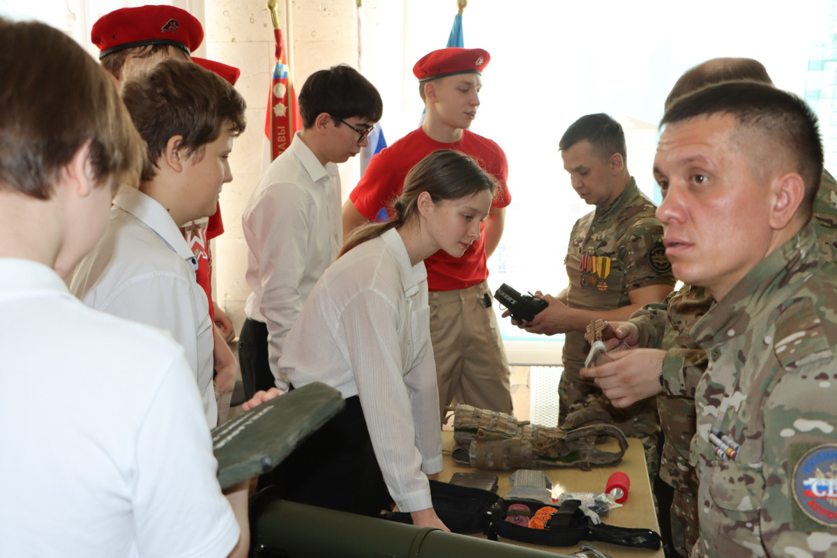 Герои принесли и показали школьникам экипировку военнослужащего. Каждый желающий смог примерить форму, посмотреть на её детали. Это вызвало большой интерес и помог ребятам лучше понять, что значит защищать Родину.